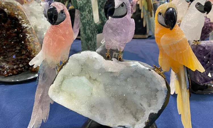 I parked at the $5 lot just off the I-10 freeway and walked through the first tent I saw open. A heavily lighted display featured huge lifelike white stone eagles with golden talons looking down on me from stone pillars. Inside the booth, I met two lovely women who were eager to assist me but spoke only Portuguese. As I admired the parrots, cockatoos, and hummingbirds made from delicate carved Brazilian gemstones, their colleague, who did speak English, arrived and explained how each tail feather is made separately and how the birds’ feet are coated in 14 karat gold.